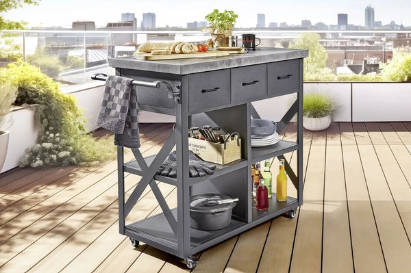 With a large 100 x 50 cm work surface, three spacious drawers, and four open shelves, there’s plenty of space for tools, food prep, drinks, and accessories. An ergonomic handle and industrial castors make it easy to move around patios, decks, and outdoor kitchens.